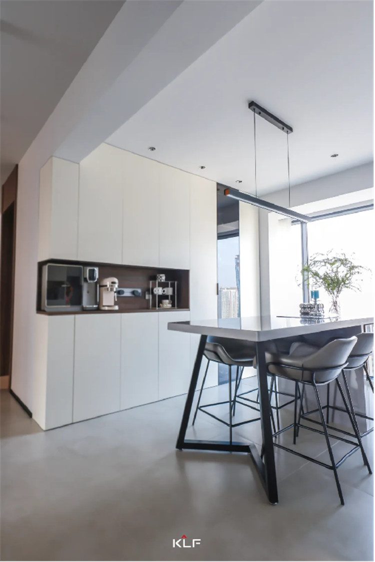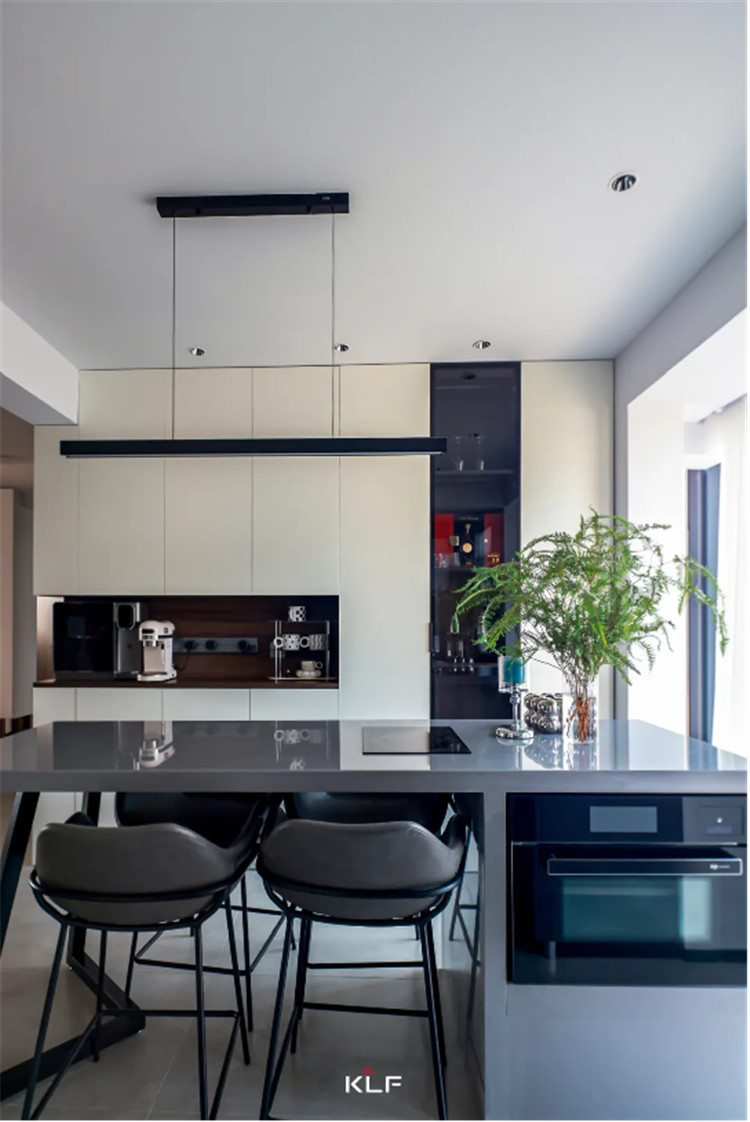 带有中岛操作台的餐桌以深灰色呼应餐边柜色彩,内嵌小型家用电器,有效节省厨房空间,几何造型餐椅时尚感十足,与餐桌适配度很高。