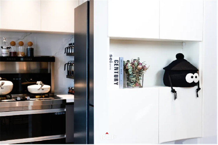 一侧到顶餐边柜结合开放格造型,以芬兰白+烟熏橡木打造温馨空间。定制柜体能够隐藏好所有电线的同时可以根据家电预留置物区域,适合注重生活品质的家人。