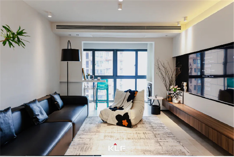 入户后左手边即为客厅,与餐厅相连彰显横厅的通透明亮。客厅家具的选用在色彩上延续了极简黑白灰的配色,让冷峻与温润中和整体气质。