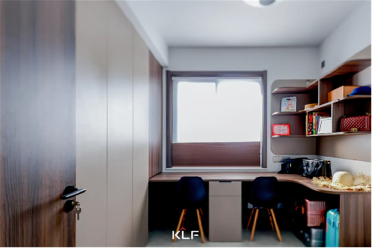 衣帽间采用嵌入式柜体设计,整排到顶衣柜保证了全家人的收纳需求,靠窗而置的书桌可同时容纳两人的学习与办公。