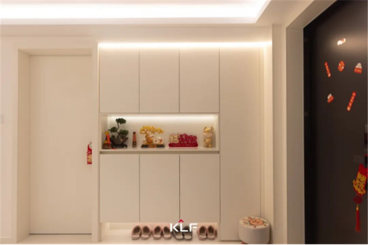 初见这个家,便有种一镜到底的酣畅感,素雅色彩与洗练线条一路铺陈,进门便跌进奶油色系的环抱中。入户区域一侧的奶油色到顶玄关柜美观实用,镂空设计方便进出门换衣换鞋和放置日常物品。褪下外部世界纷扰,疗愈每一颗归家的心。