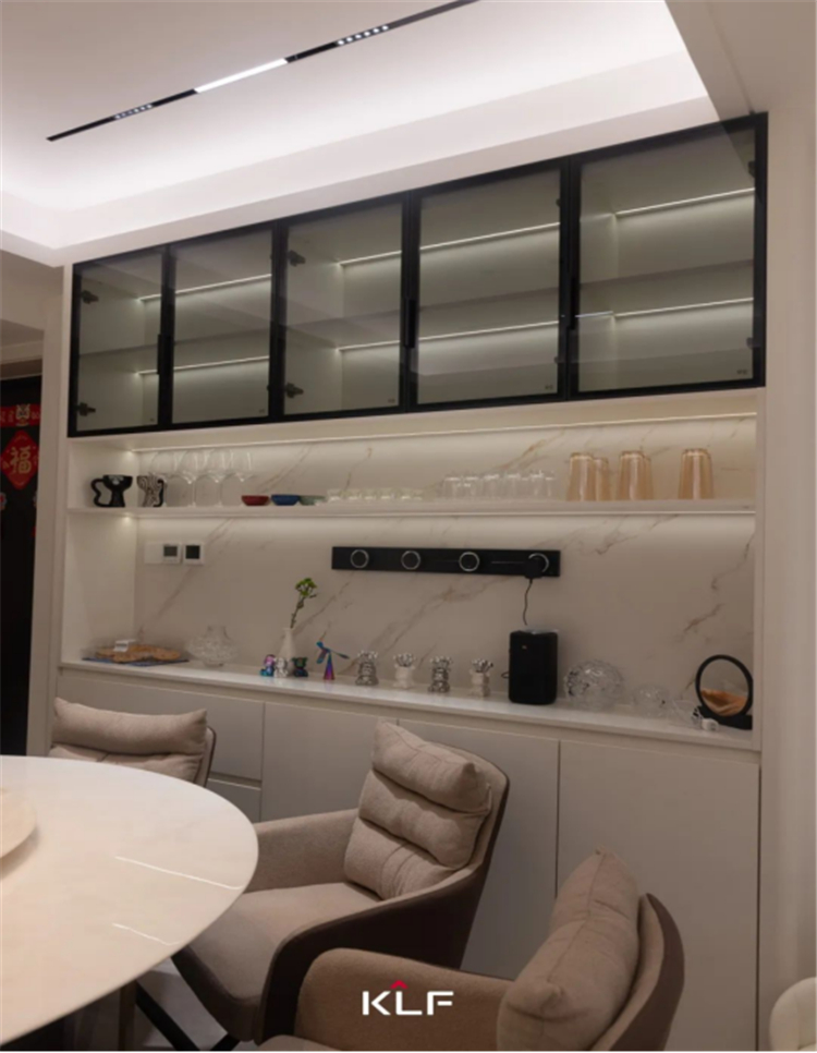 餐厅充分利用墙体打造出餐边柜,平整利落的嵌入式设计让冰箱无缝融入背景,极大提升空间整体感。透明收纳柜既调控着视觉的通透性,又兼顾了开放性与私密性的需求。圆形餐桌安静立于空间中,容纳家人相围而坐,灯火可亲,洄游动线让家庭互动感更强。
