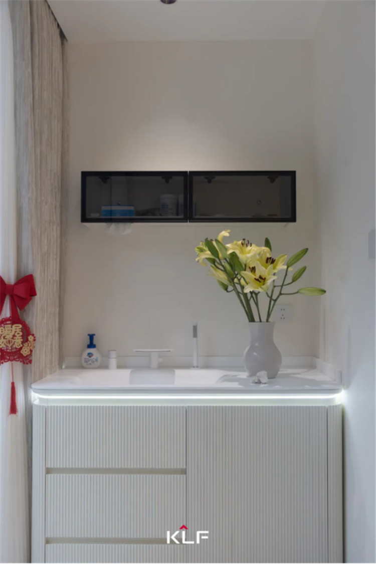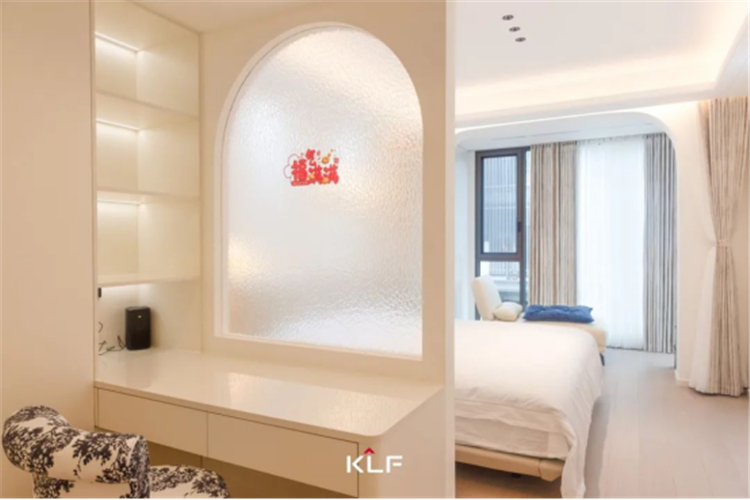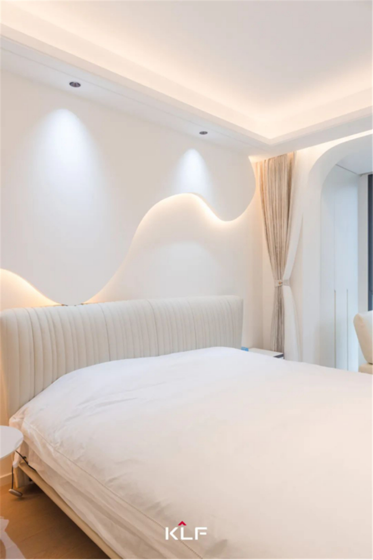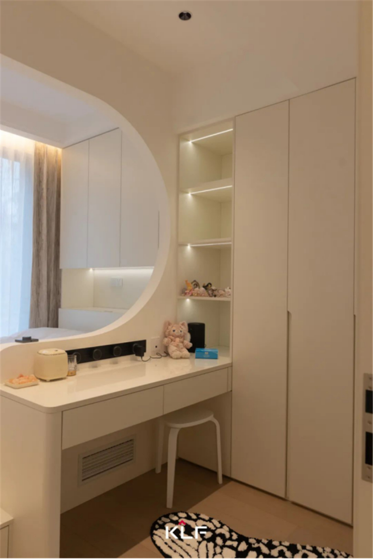 设计解锁更加精简的生活方式,打造流畅的洄游动线。以柜为墙围合出一隅衣帽间和梳妆台,与主卧构成嵌套关系,提升空间利用率和居住便利性。床头背景墙、门洞垭口、玻璃隔断,多处采用圆弧线条勾勒轮廓,具体而微的细节,消弭大面积纯色的乏味和单调,交汇成生活的丰富质感,满足居住者的审美期待。