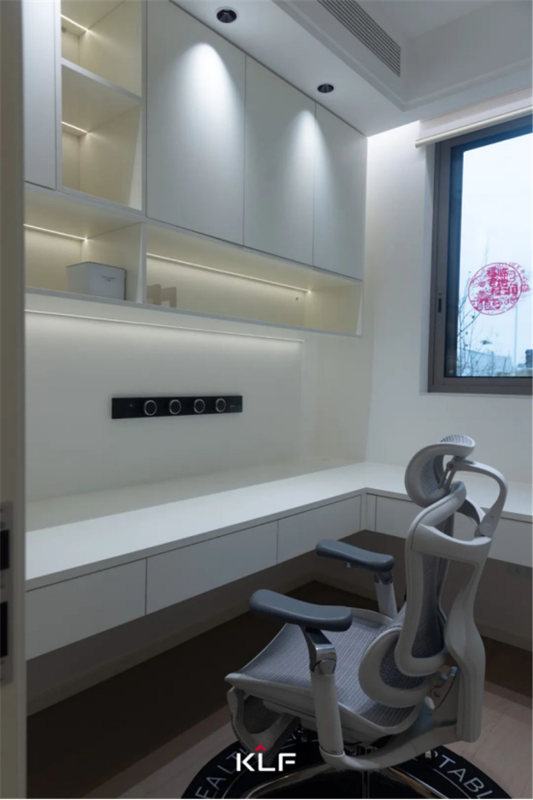 盈于咫尺,乾坤造境。书房是一个能让人沉浸式思考与放松的理想天地。作为业主自己的精神空间站,书房靠墙定制吊柜和悬挑书桌,精简有序、宽敞通透,强大的收纳功能将琐碎尽数归置。