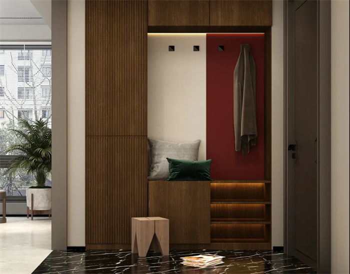 贴心设计从打开家门的那刻开始,结合玄关打造一个换鞋凳,便于进出门脱换鞋,避免因站立弯腰换鞋发生磕碰、摔倒等情况。