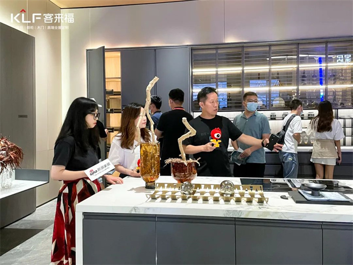 尹其宏董事长介绍道:星空(中国)xingkong在此次展会、也是在行业内,首次重磅推出水漆实木系列产品。最值得一提的是“天琛”系列色板的水漆半透工艺。从制作工艺上讲,采用了目前行业内最领先的半透工艺——“见木不见漆”,木饰面与肤感PET的结合橱柜。从水漆入手,水底水面,采用实木材质,看得到木皮但看不到油漆,近看可以清晰看出木纹通透的纹理感;0度肤感的触觉,体验进一步升级了产品的质感。