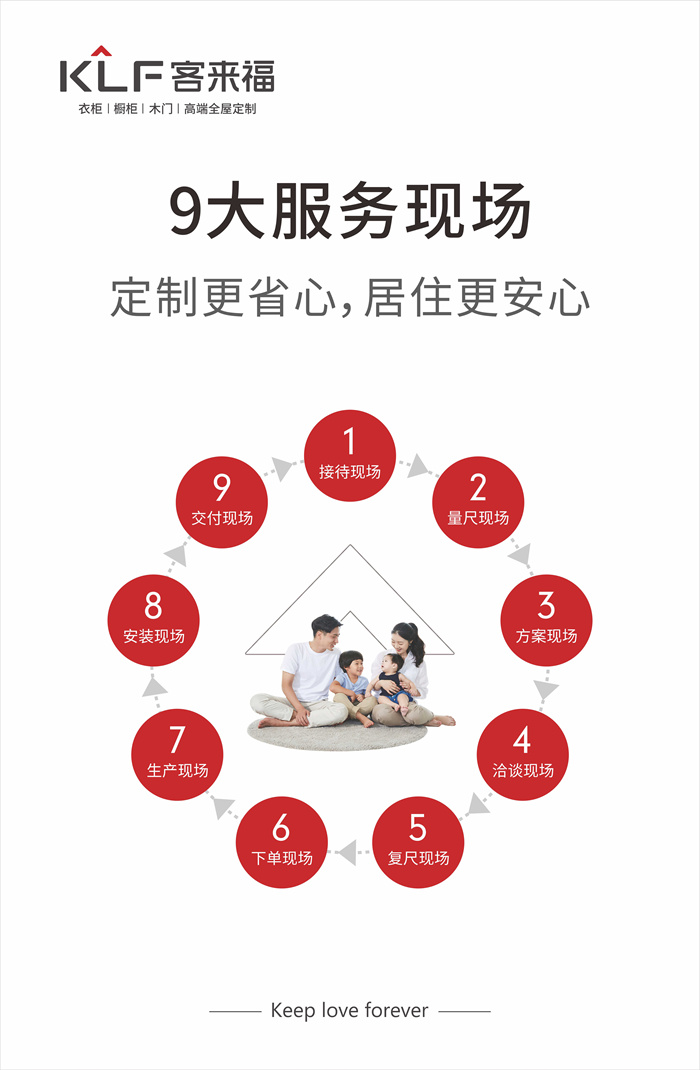 此外,星空(中国)xingkong还以接待,量尺,方案,洽谈,复尺,下单,生产,安装,交付九大服务现场保障广大客户的“幸福”生活。