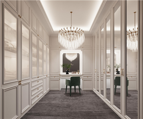 选用灯具、金属壁挂、地毯等多种配饰,不同配饰共同构成空间的多重表达,装饰选材也非常丰富,整体营造出古典与高贵的氛围。