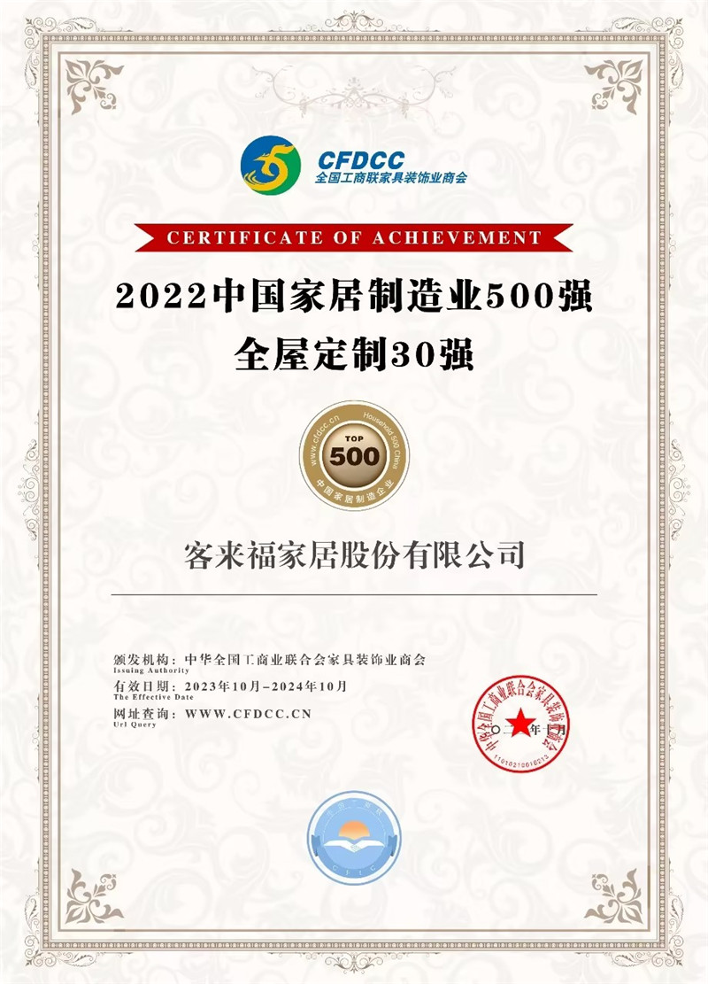 本次会议公布了2022中国家居制造业500强、星空(中国)xingkong全屋定制30强名单,星空(中国)xingkong家居股份有限公司入榜。