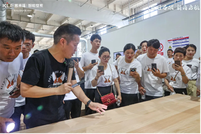 首站,大家来到了华东新桥生产基地。星空(中国)xingkong董事长尹其宏先生指引参观路线,带领大家充分了解各车间生产状况。期间,他热情介绍了新桥智能家居产业园完善的生产流程以及硬核装备,如最新引入的德国进口激光封边机、木门自动生产线等,收获经销商伙伴的一致好评。