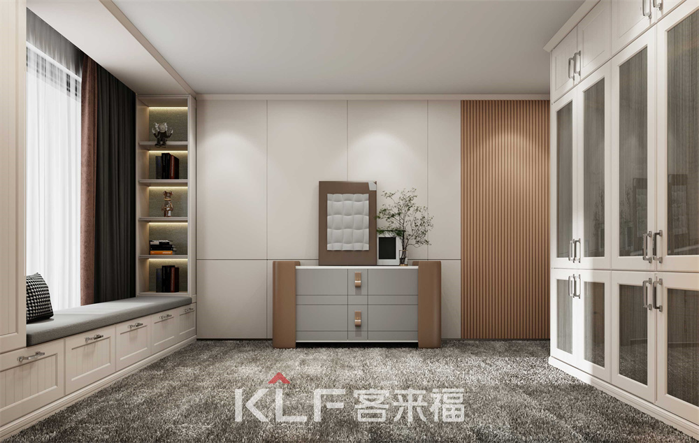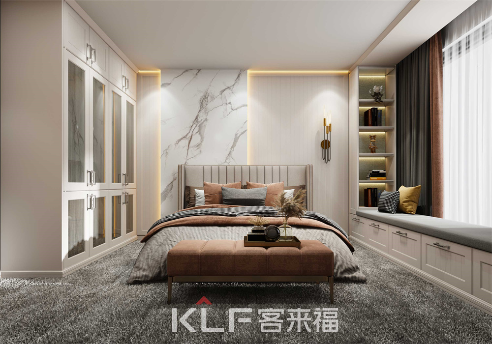 卧室的栅格背景墙和模压护墙,做出了高定混油的产品效果,超晶板和岩板等超现代感的元素的融入,更是将简欧这一经典风格产品做了颠覆,更符合当下消费人群让客户生活更加自然。