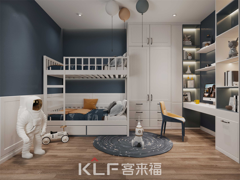 儿童房空间延伸了设计的色彩主题,不同饱和度的蓝色配合深邃的星空蓝,冷静并充满思考,L形的设计也被充分利用。