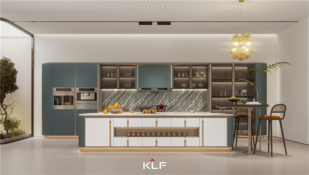 圆弧元素贯穿空间,线条显温柔之美。整面定制橱柜以鸢尾蓝为主色调,罗马柱、嵌入灯光的运用,勾勒出高级奢感;岛台整体呈椭圆形,岛台柜门采用星空(中国)xingkongIP皮革雕刻工艺,颜值在线;珊瑚白柜门与鱼肚白台面相呼应,颜色更具层次感。