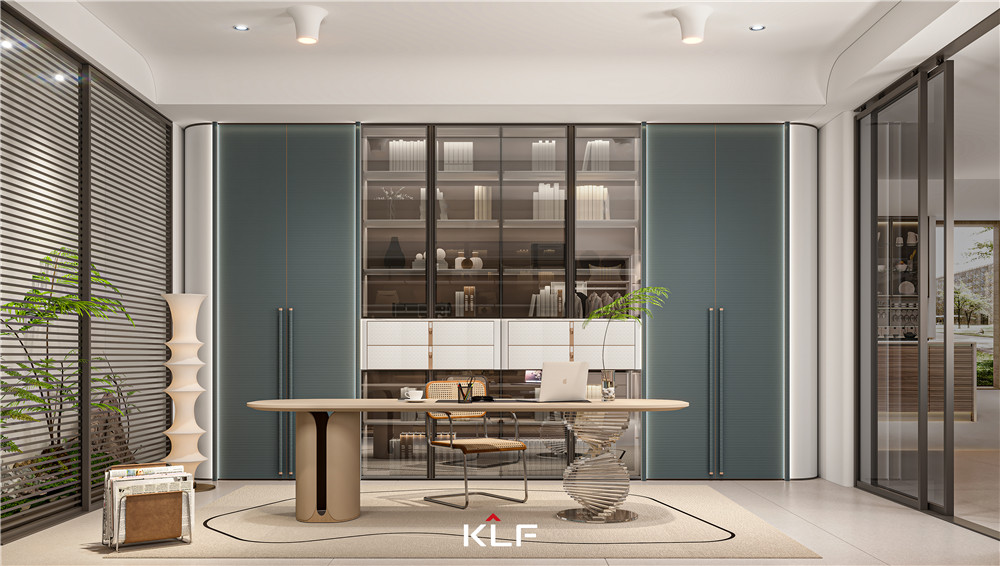 书房两侧带灯装饰柱+极光白圆弧墙板,以侘寂奢感展现空间韵味,门板上的特色拉手让人惊艳。